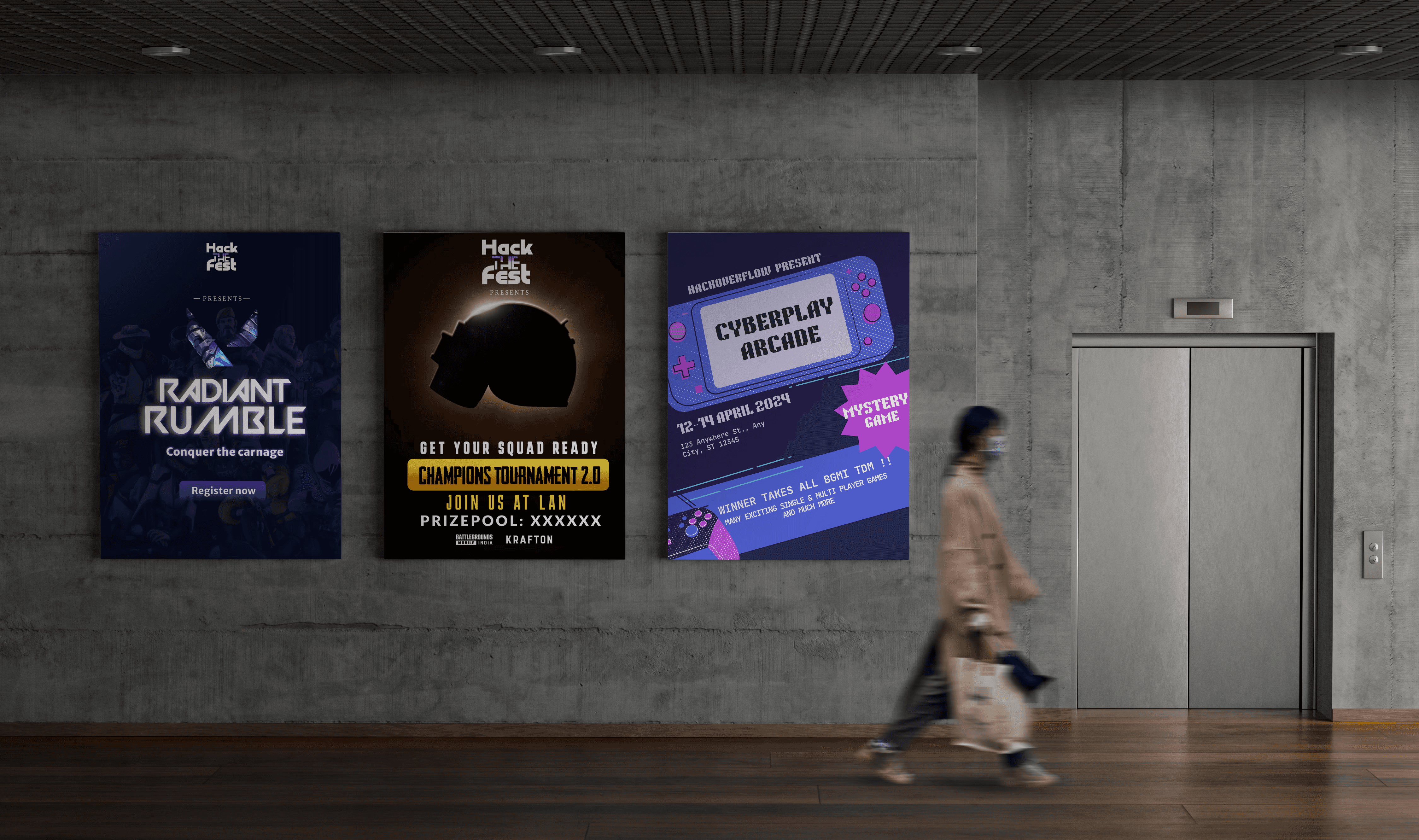 The event’s visual and structural design integrates a modern, tech-centric aesthetic with minimal yet bold graphics. Each category—Hackathon, Robowars, Valorant, BGMI, Arcade Jamming—receives distinct branding for identity coherence. Posters, digital assets, and on-ground layouts are crafted for high engagement, futuristic appeal, and ease of participant navigation across multiple event zones.